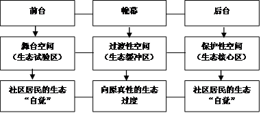 前台是接待游客的区域,是游客与生态环境、当地社区和原著居民深度对话的区域;帷幕,是前台与后台之间的一个“缓冲区”,它是前台与后台的过渡空间,其功能类似于舞台的帷幕;后台一般情况下秘不示人,只有与后台相关或后台允许进入的人才能进入后台。后台是供游客基于“凝视”的态度去审视生态文明的场所。