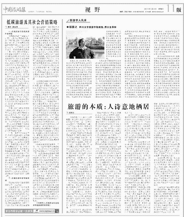 杨振之教授《旅游的本质:人诗意地栖居》一文刊登于2012年1月4日“中国旅游报——旅游学人风采”栏目。文章从哲学的角度出发,提出旅游的本质是“人诗意地栖居”。旅游者将兴趣点集中在特殊经历和旅游体验,通过体验,在旅游地完成短暂的“诗意地栖居”,从而实现在迷茫的世俗生活中短暂的找回自我,回归本我,发现自我的生命意义。