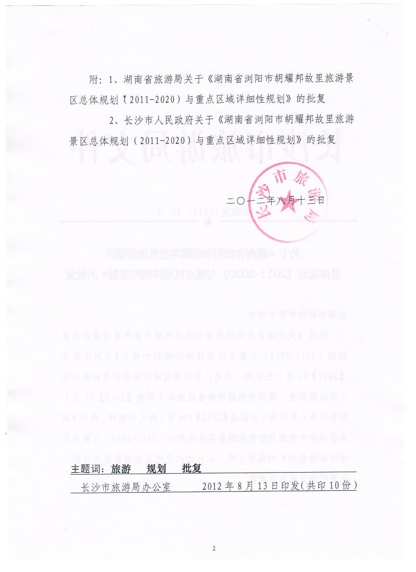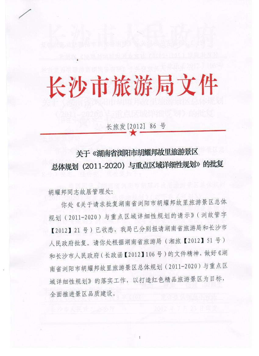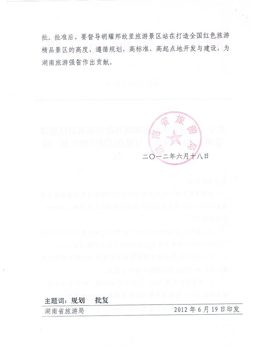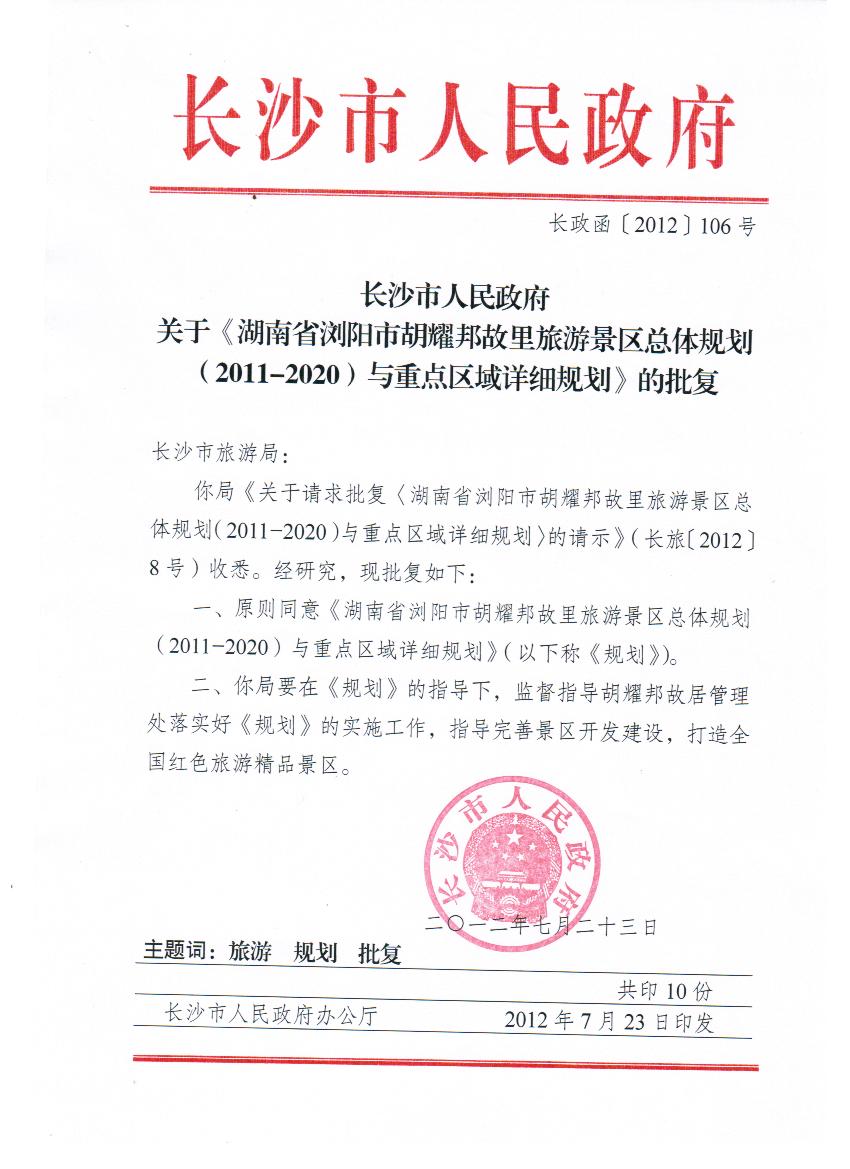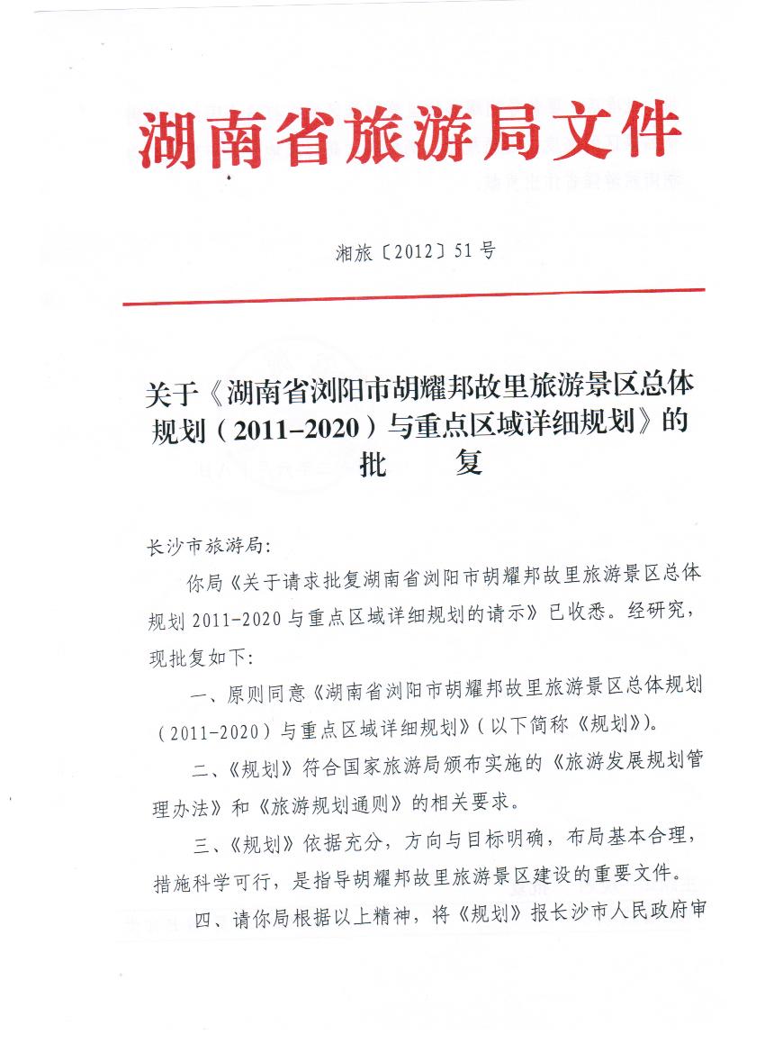 我公司承担的《湖南省浏阳市胡耀邦故里旅游景区总体规划(2011-2020)与重点区域详细规划》获得湖南省旅游局、长沙市人民政府、长沙市旅游局正式批复。
