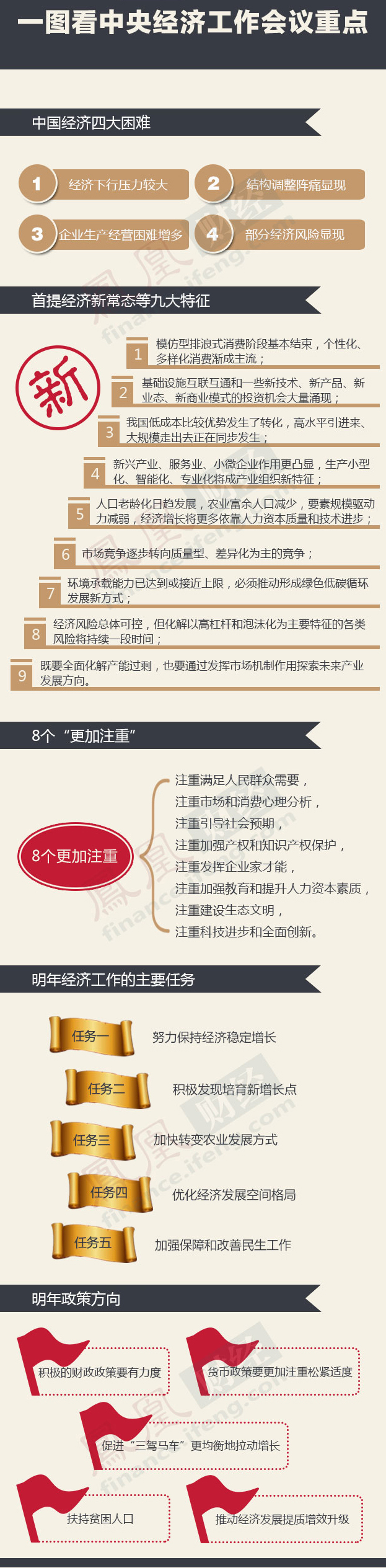 2014年12月11日,中央经济工作会议提出明年经济工作的主要任务:1、努力保持经济稳定增长;2、积极发现培育新增长点;3、加快转变农业发展方式;4、优化经济发展空间格局;5、加强保障和改善民生工作。同时,对经济发展新常态的九个方面以及需要更加注重的八项工作做出说明和部署。